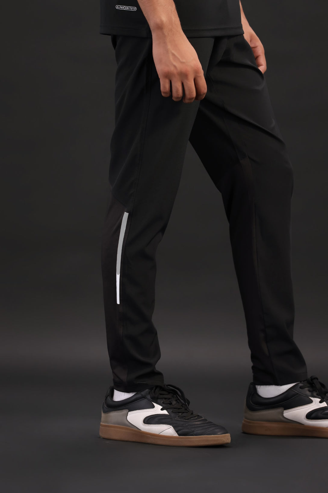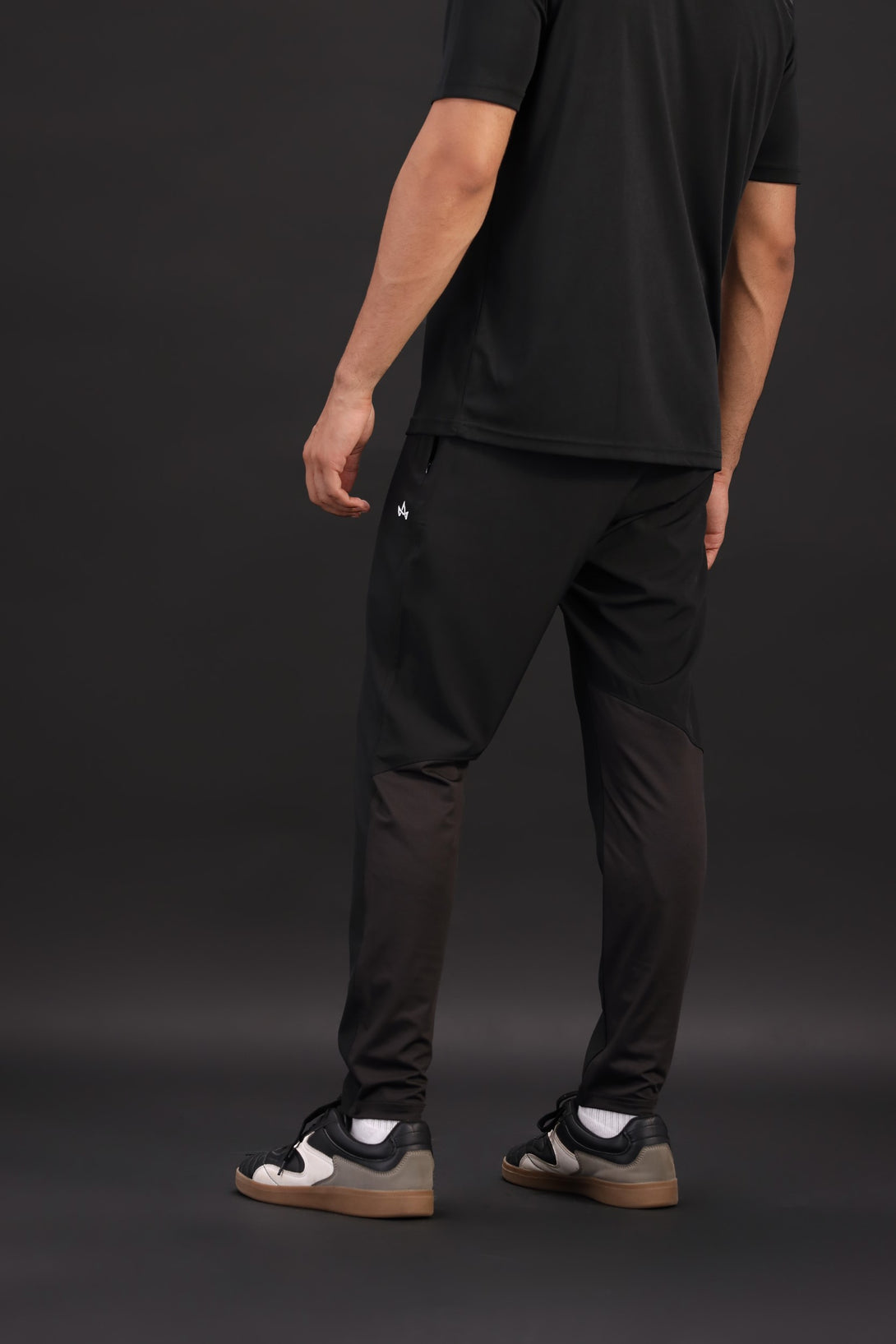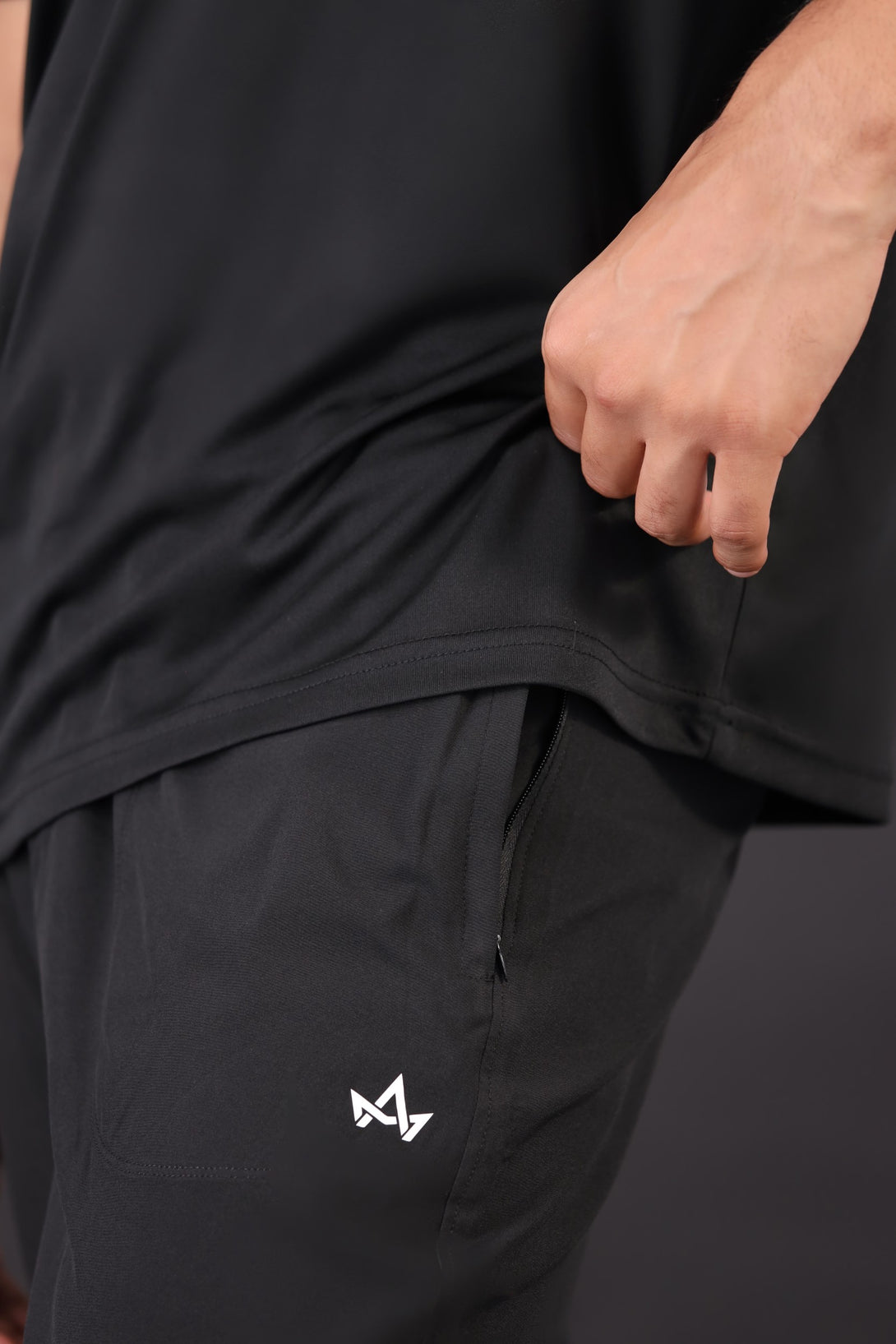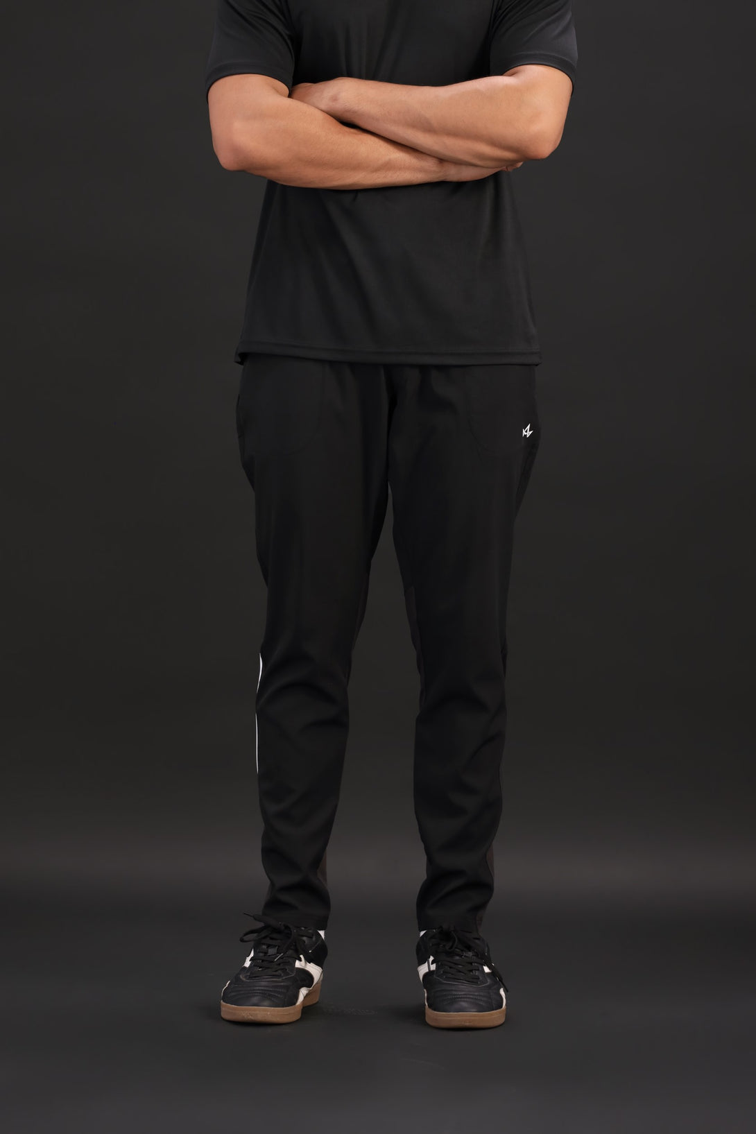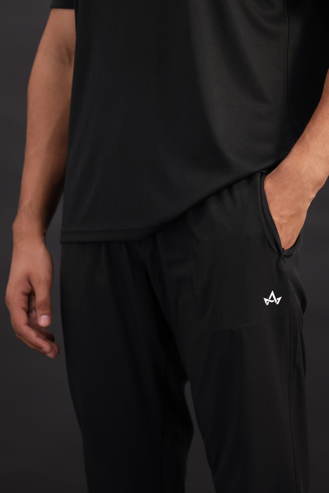 Designed for active comfort, these black workout trousers feature breathable fabric for optimal airflow. Zippered side pockets provide secure storage, making them ideal for gym sessions or outdoor training.