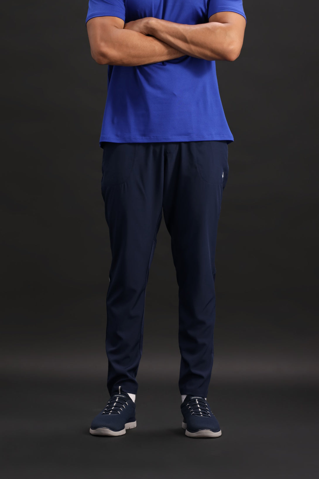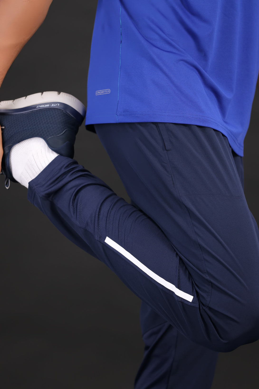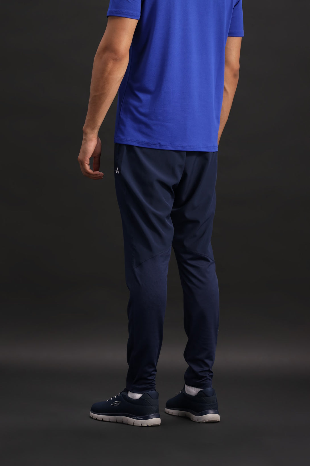 These midnight blue trousers combine performance and style, crafted from moisture-wicking material. Side pocket zip closures keep your essentials safe while maintaining a sleek athletic silhouette.