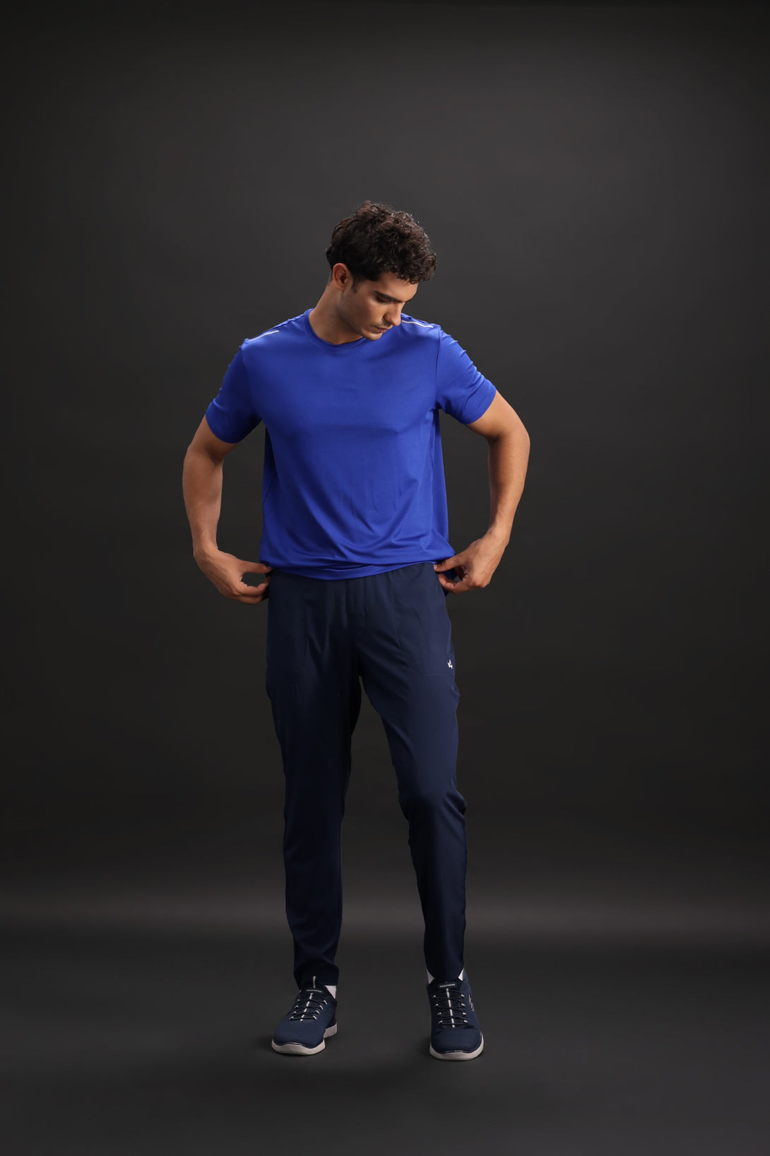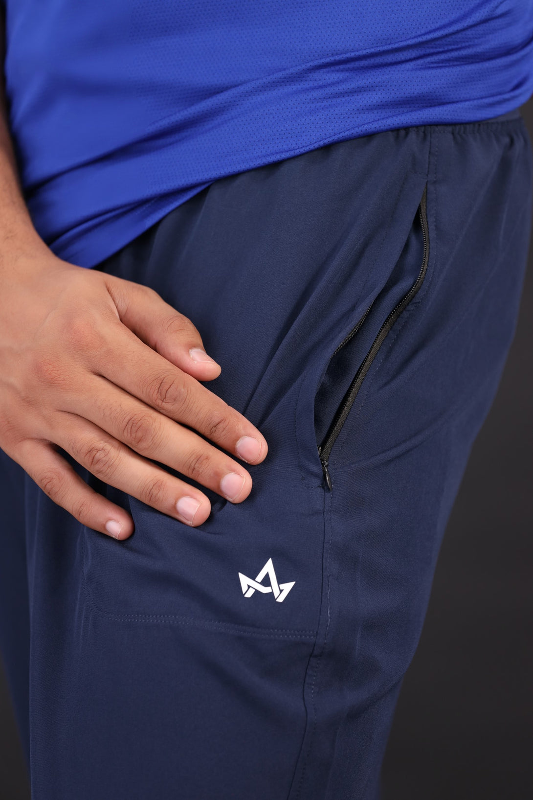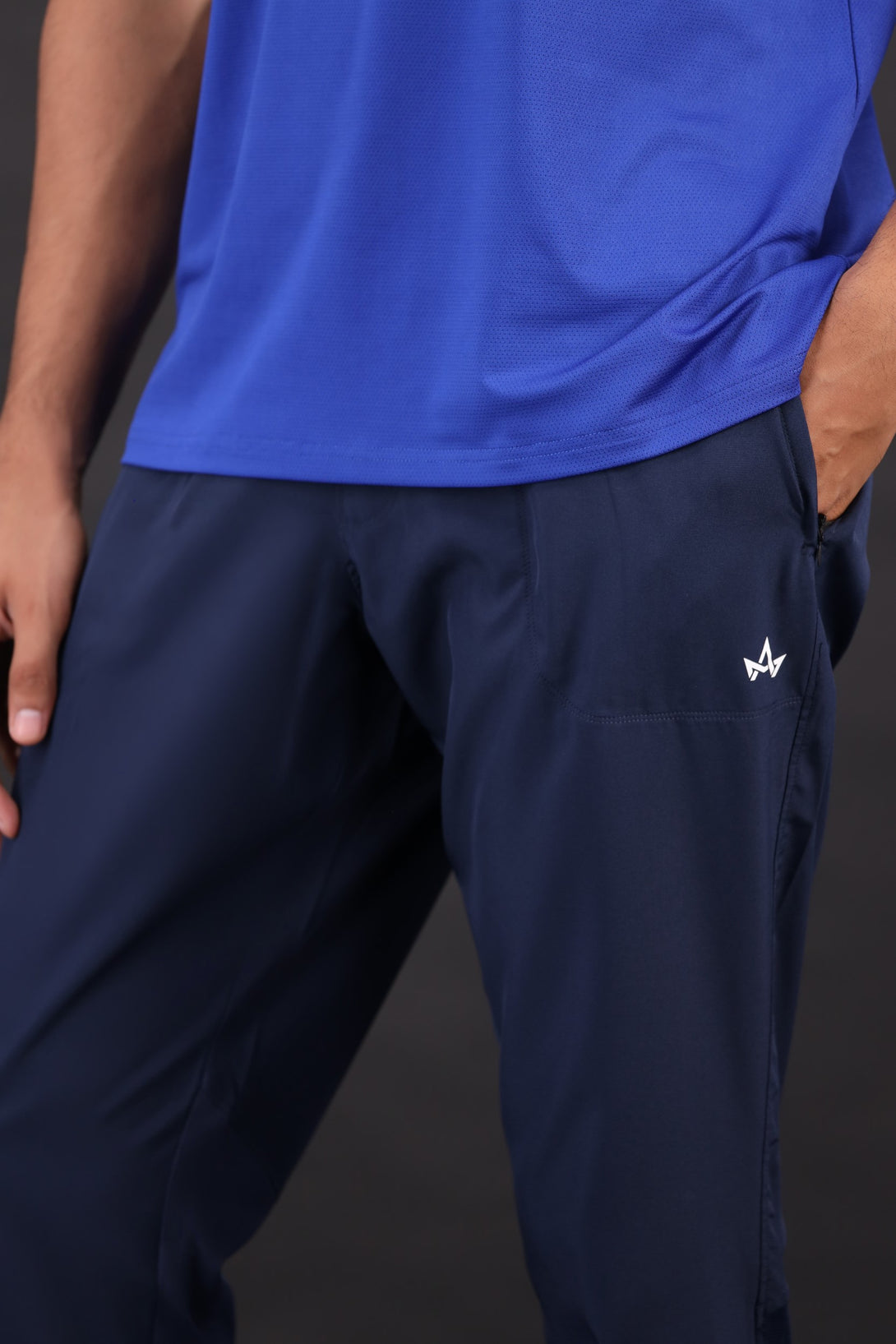 These midnight blue trousers combine performance and style, crafted from moisture-wicking material. Side pocket zip closures keep your essentials safe while maintaining a sleek athletic silhouette.