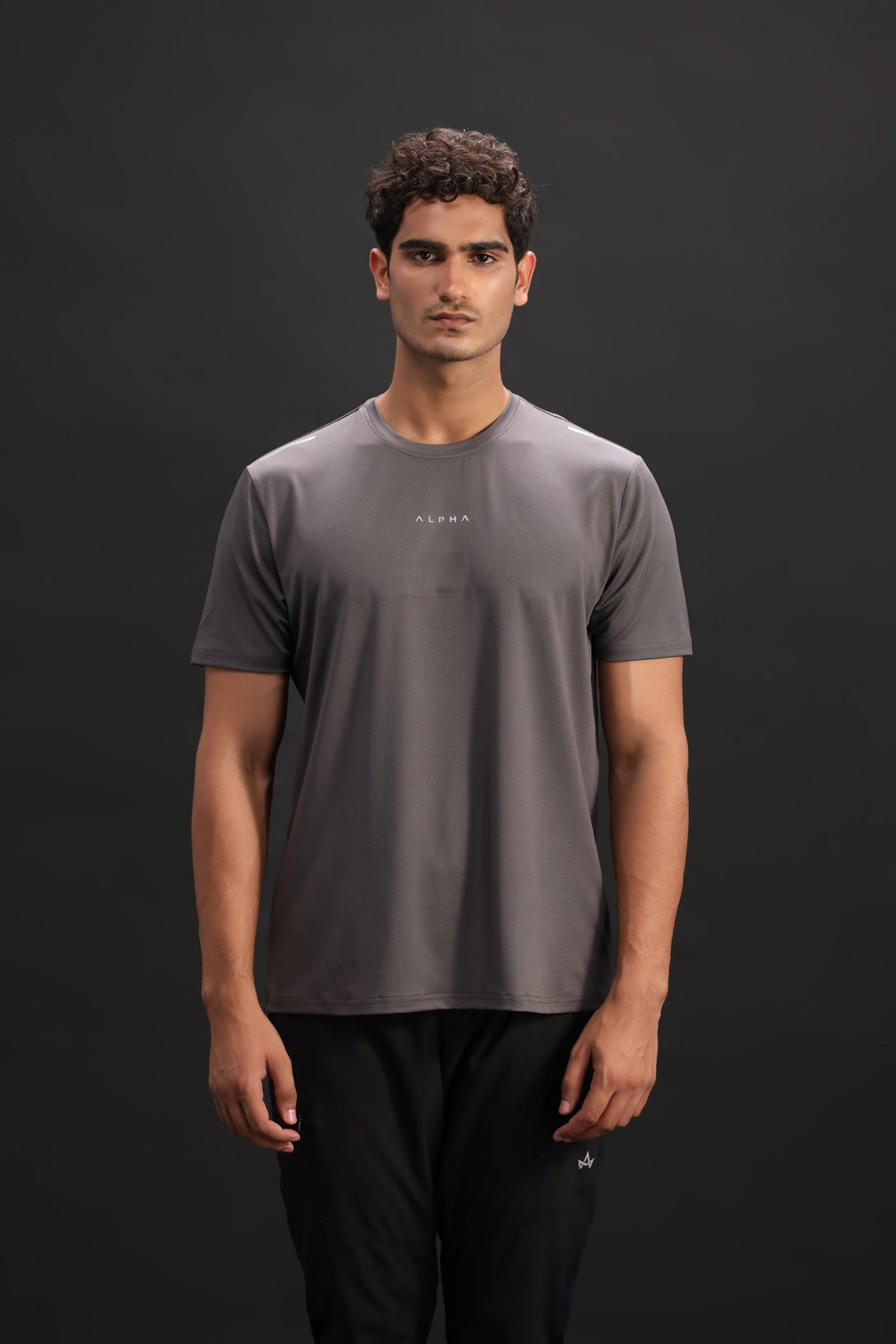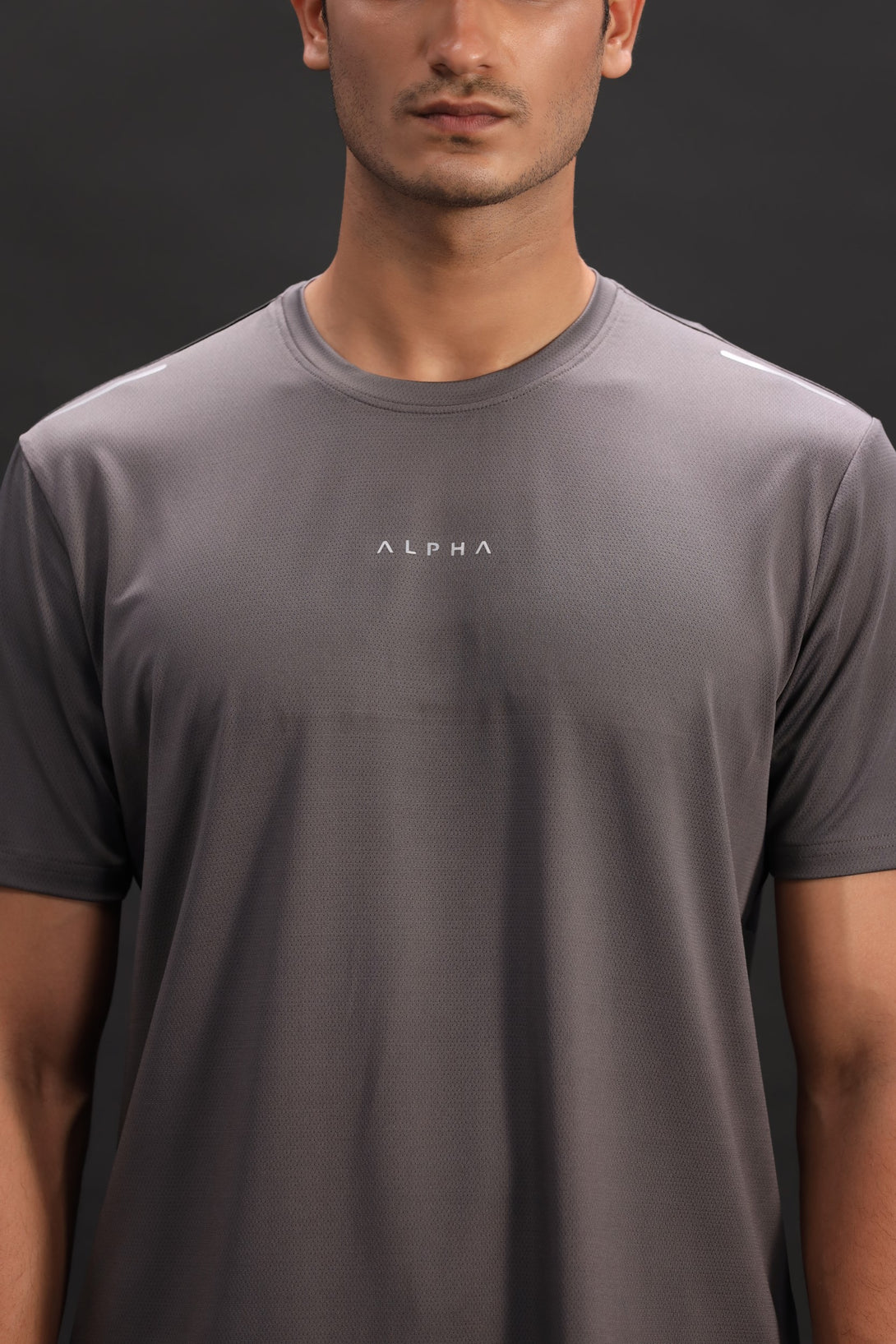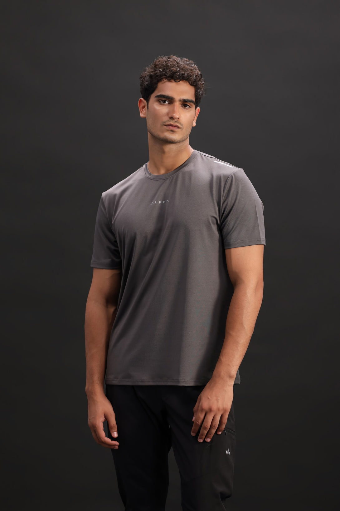 This metallic grey t-shirt blends sleek style with function, highlighted by reflective tape accents and center chest branding. Ideal for early morning or late-night training.