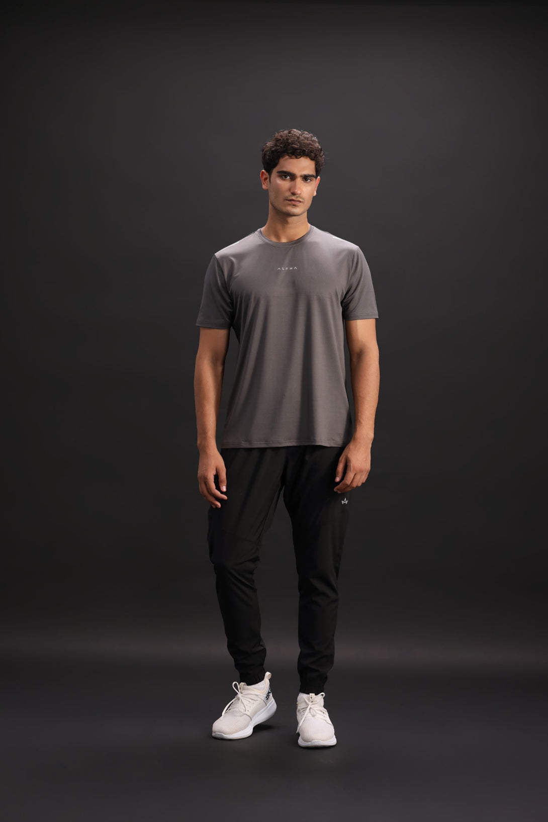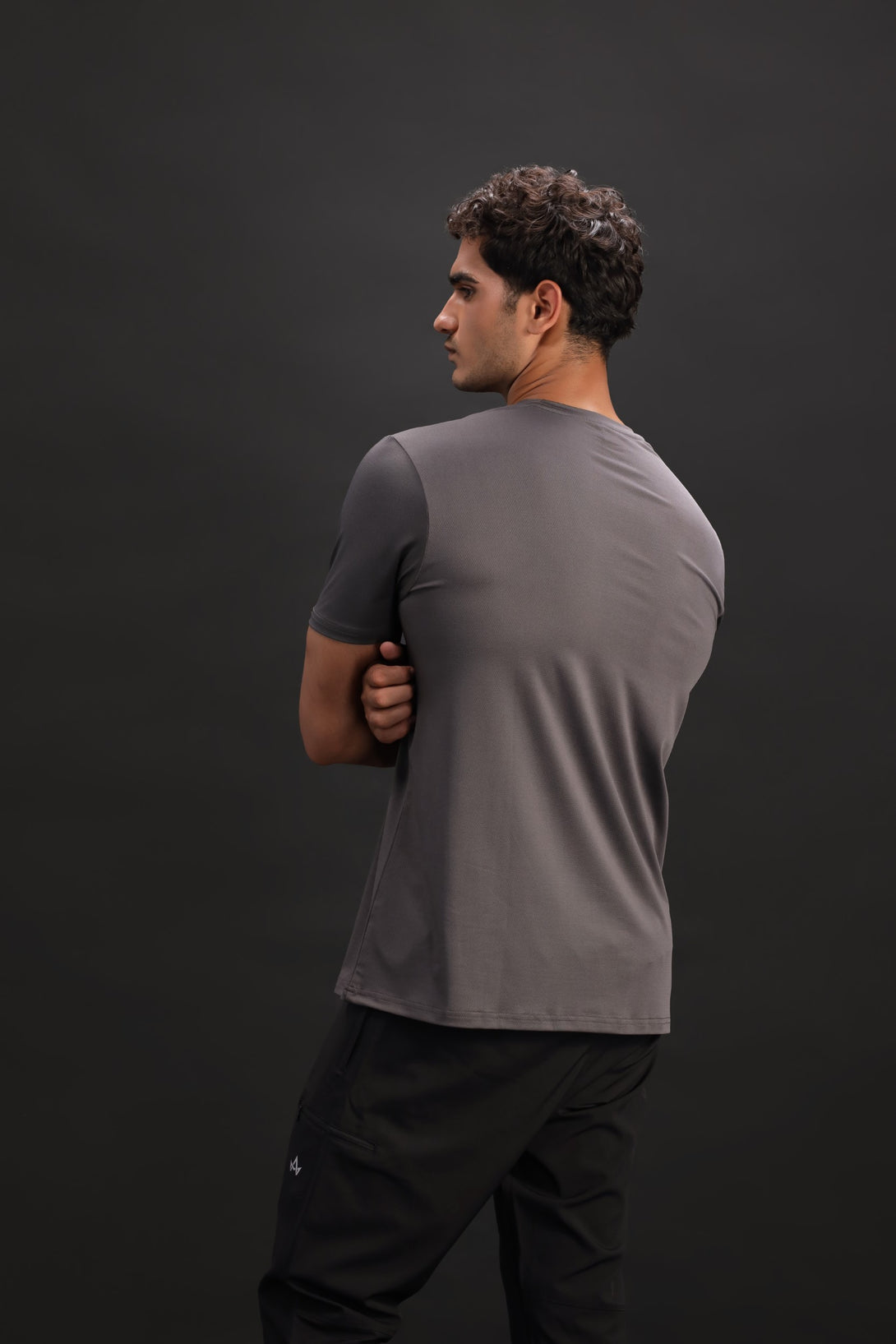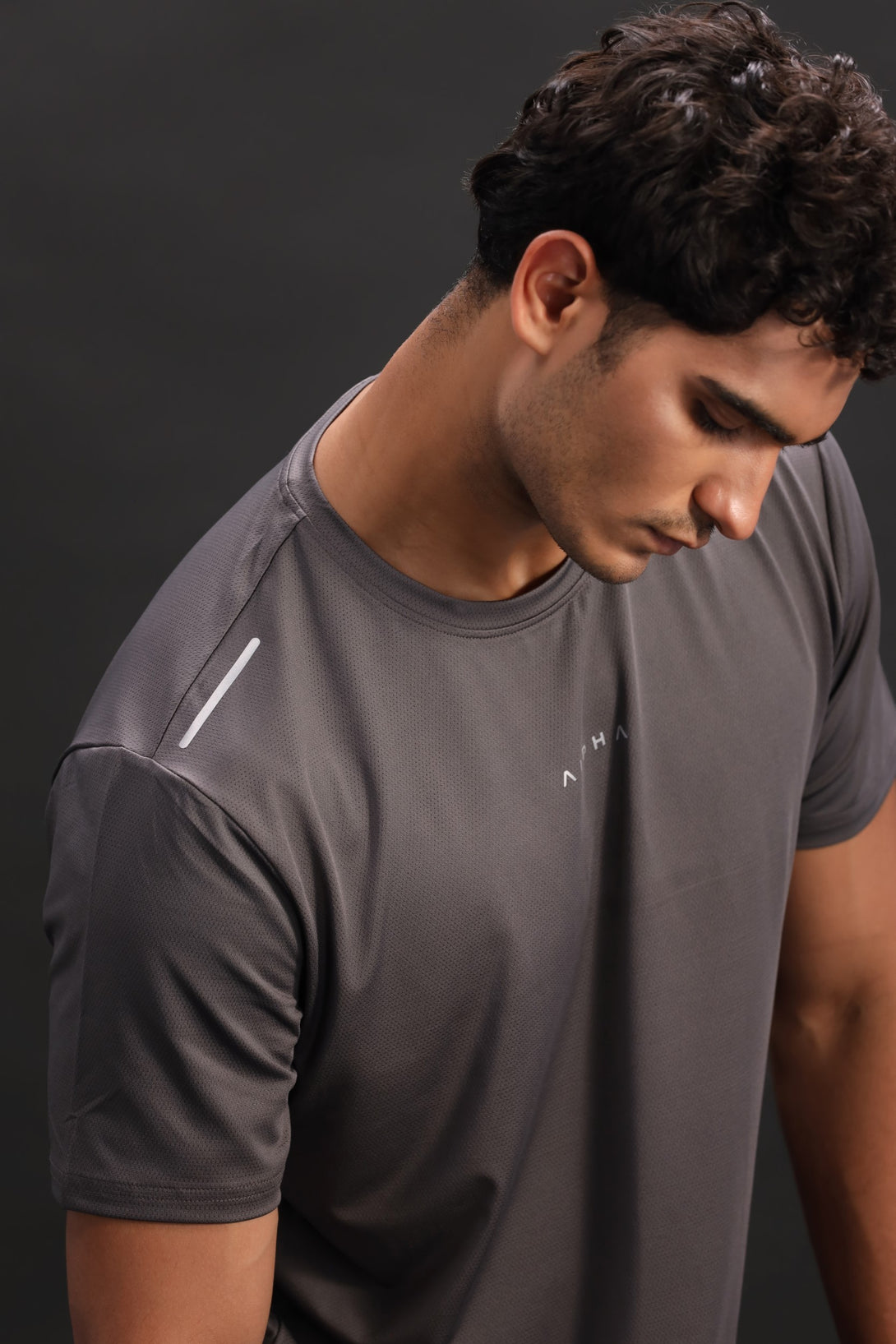 This metallic grey t-shirt blends sleek style with function, highlighted by reflective tape accents and center chest branding. Ideal for early morning or late-night training.