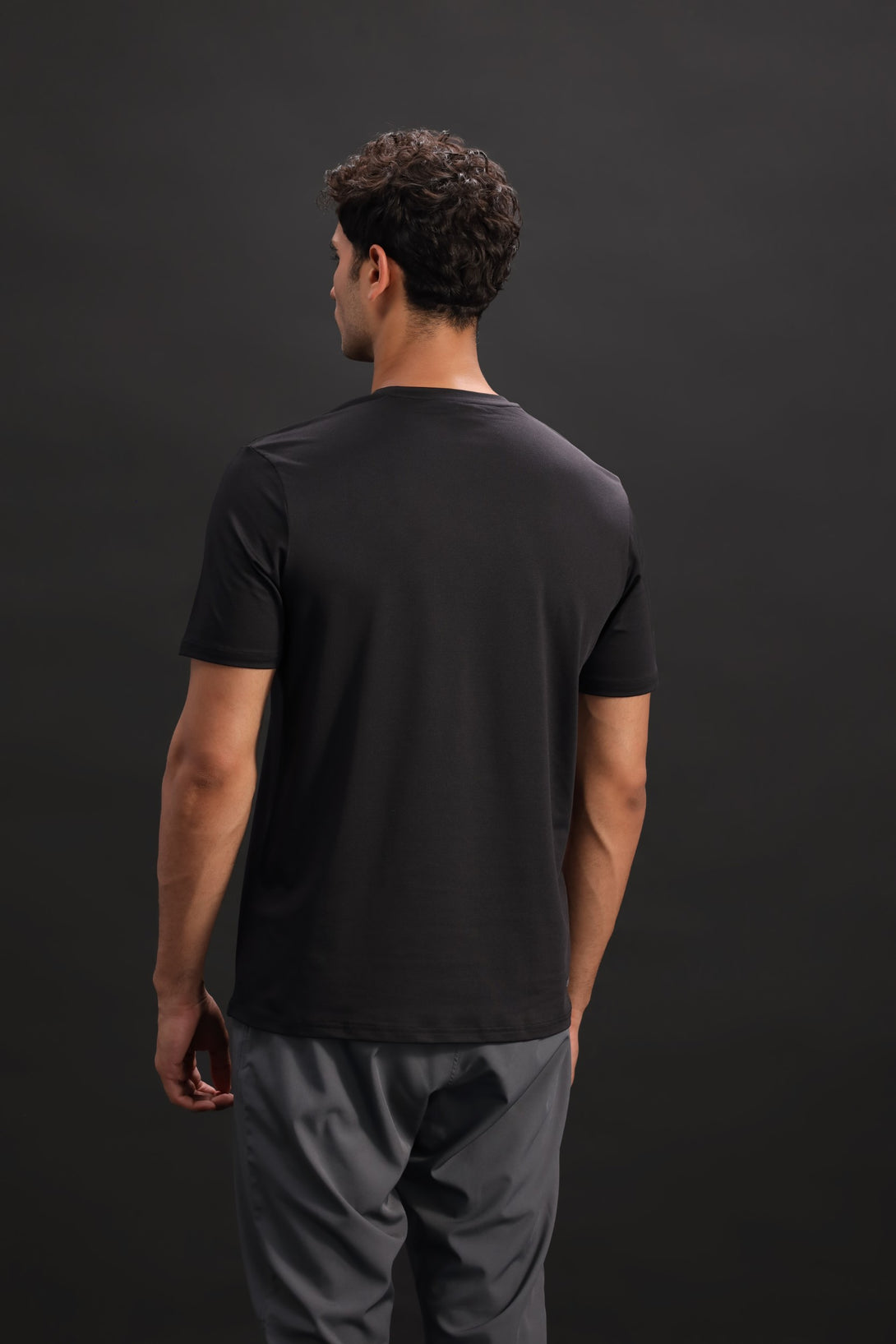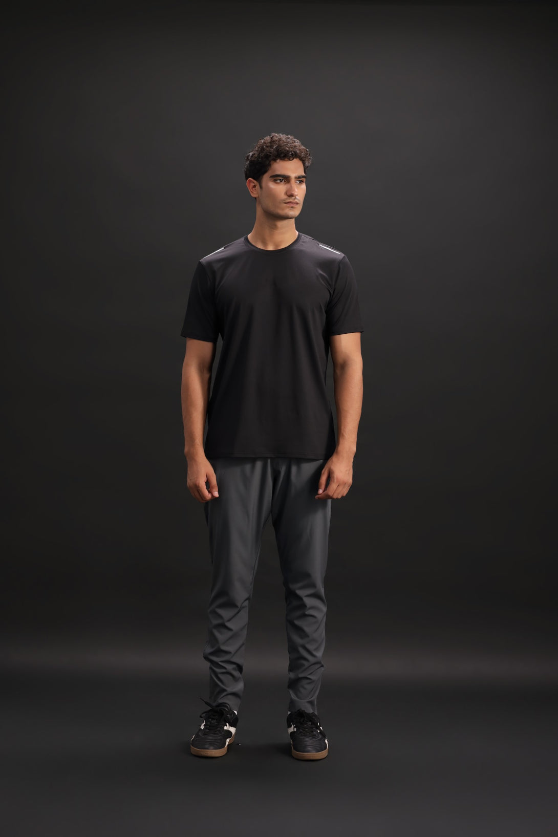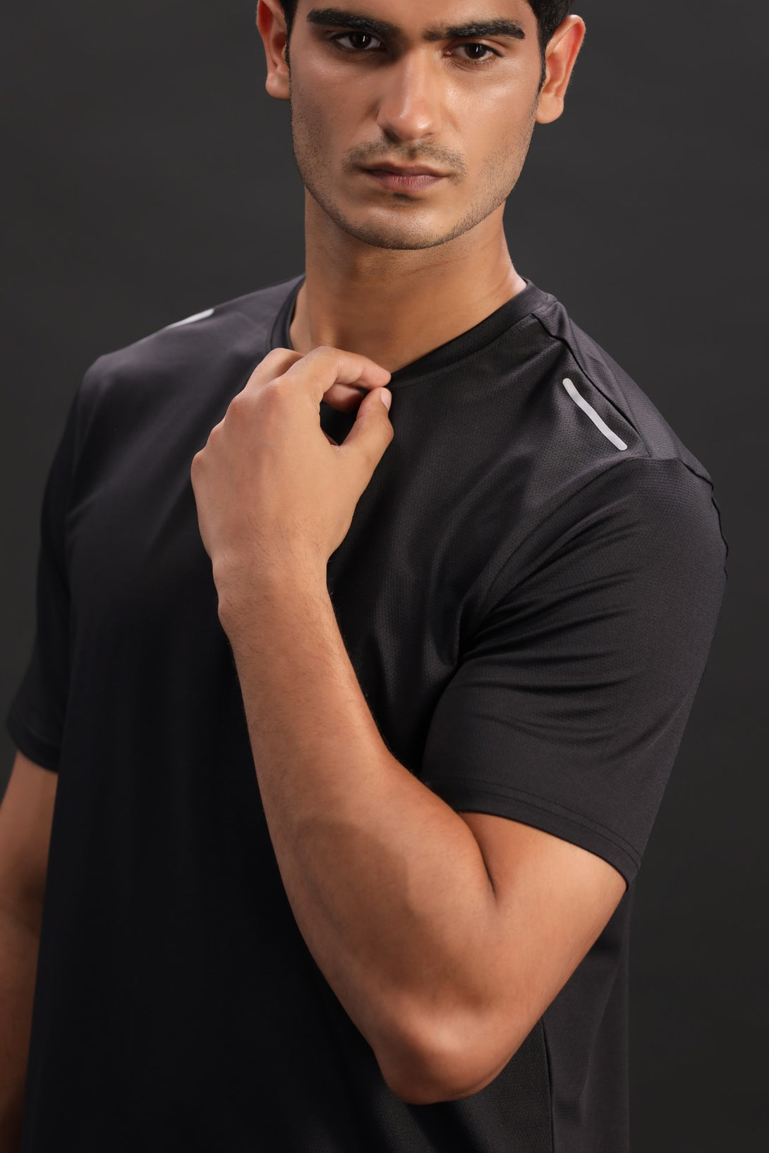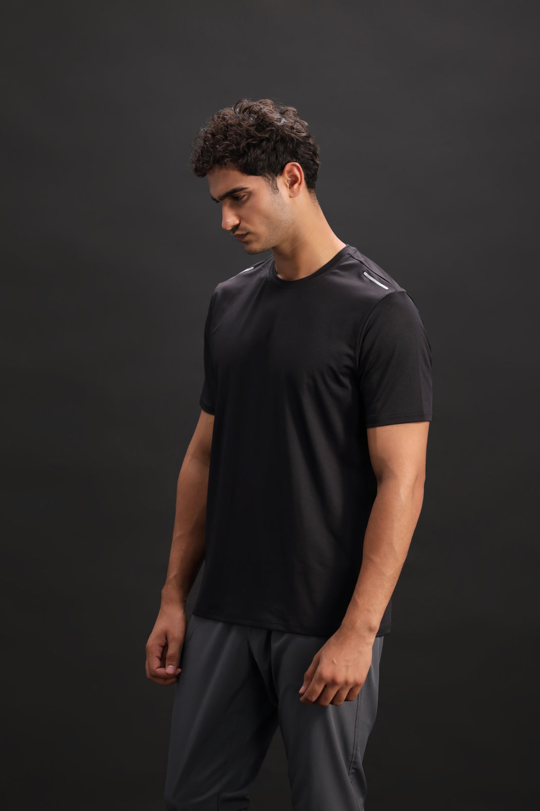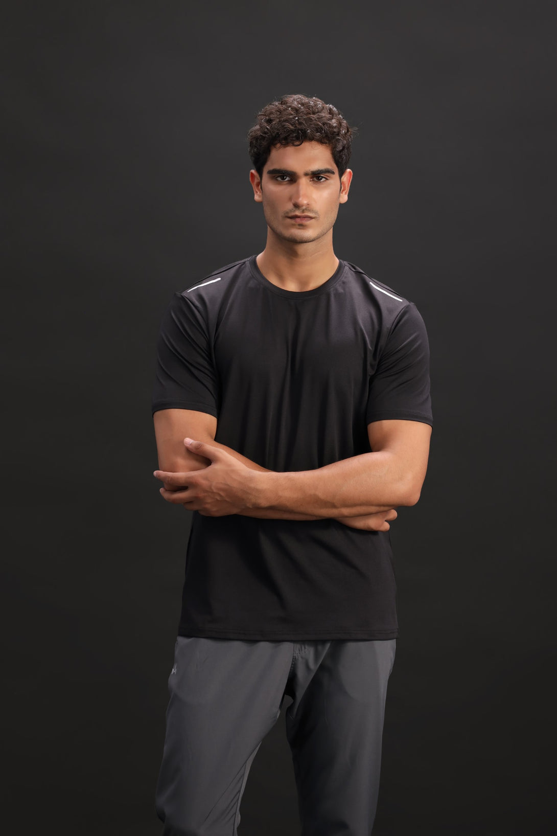A true staple, this black performance tee features reflective tape on the shoulders for enhanced visibility. Minimalist, breathable, and made for everyday training.