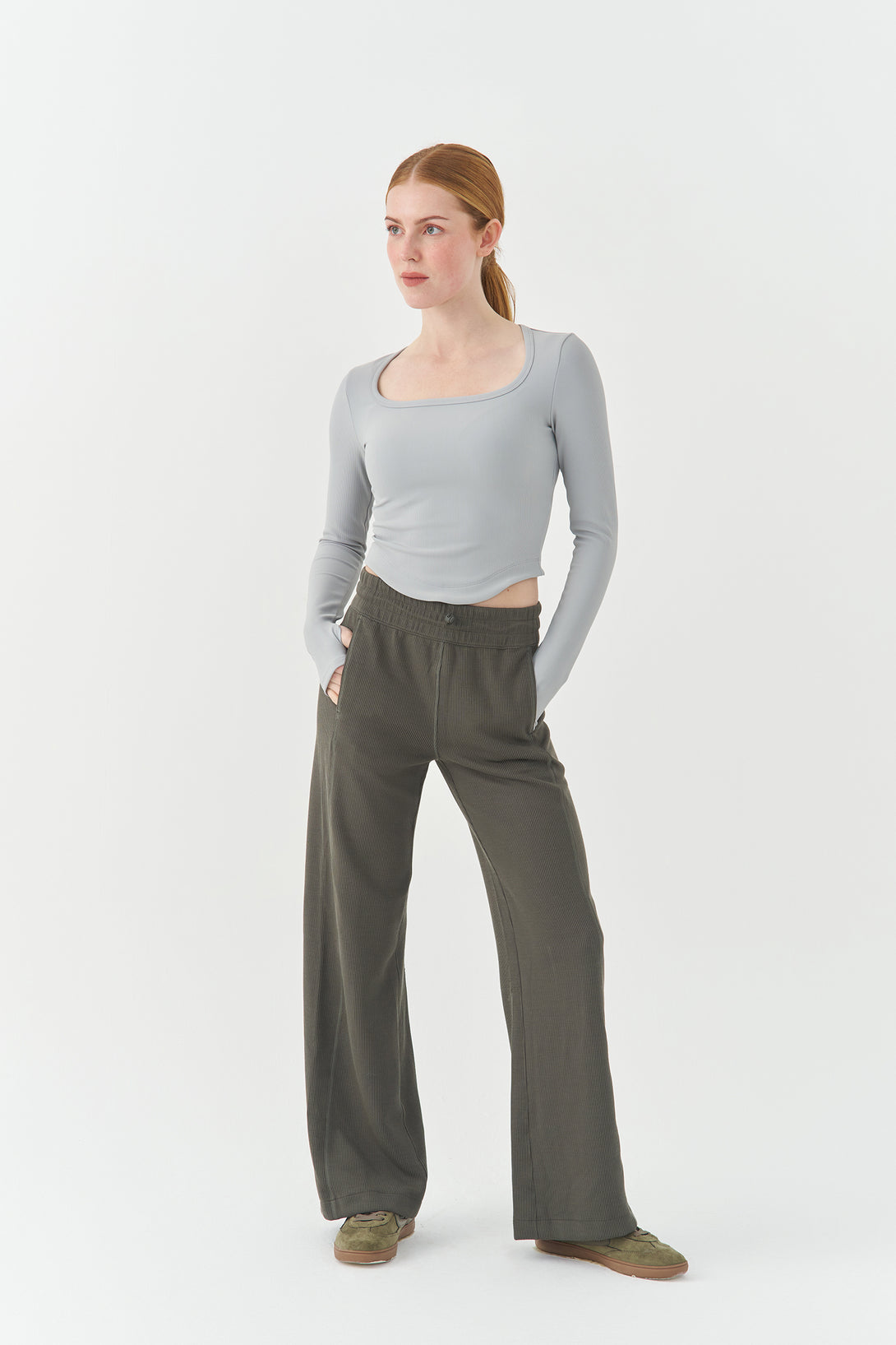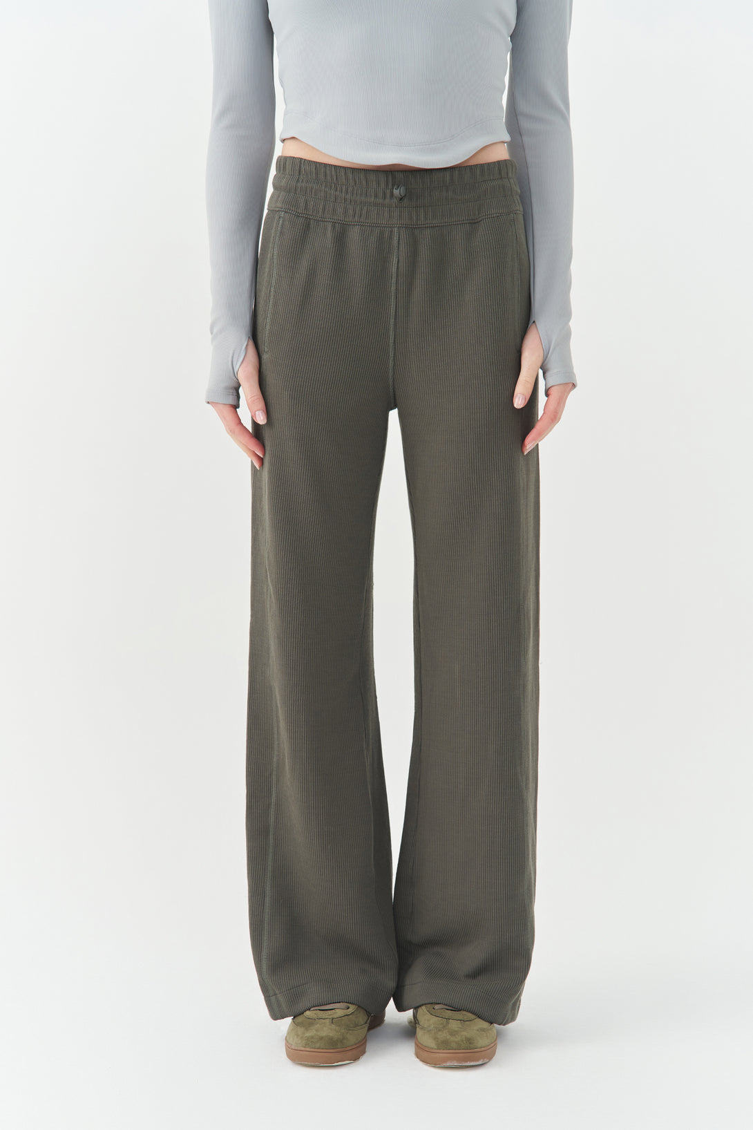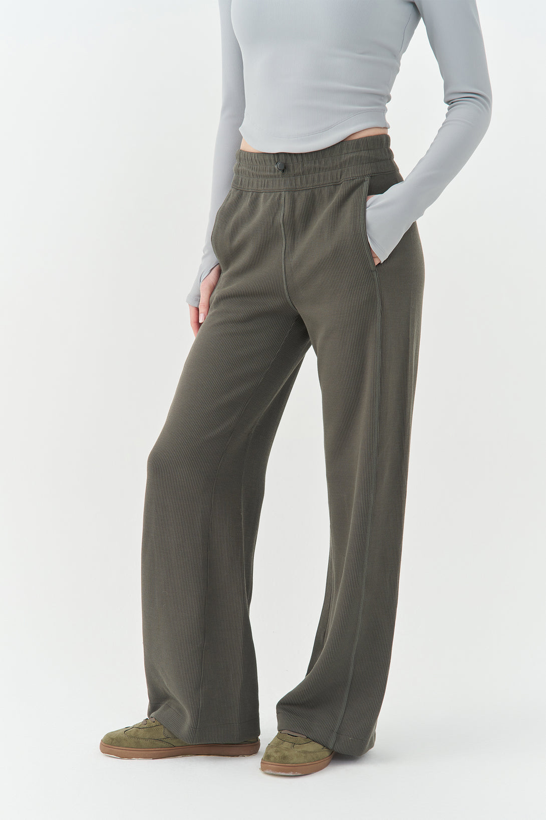 - Fluid straight-leg drape for graceful movement