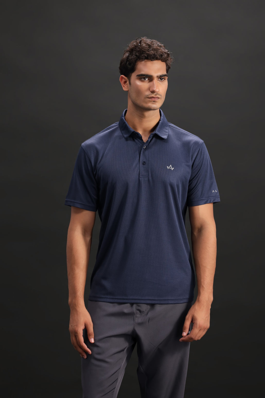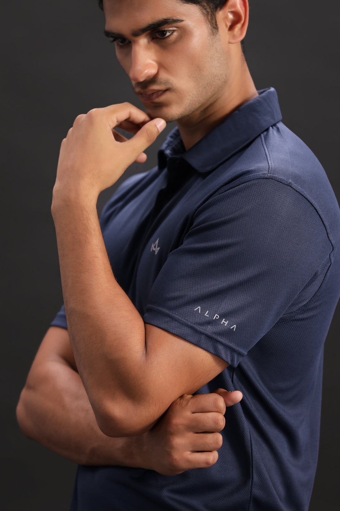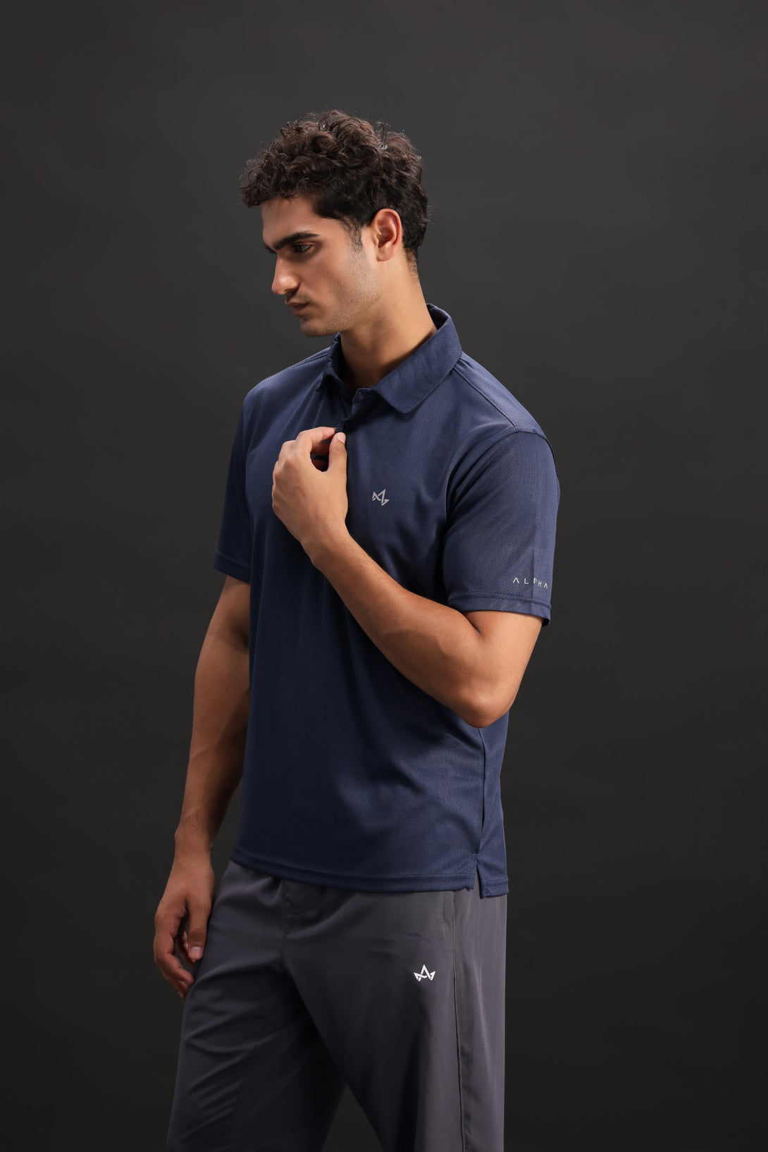 Sophisticated yet sporty, this midnight blue polo offers active ventilation, a chest logo for subtle branding, and Alpha's name displayed on the arm. Ideal for smart training or active lifestyle wear.