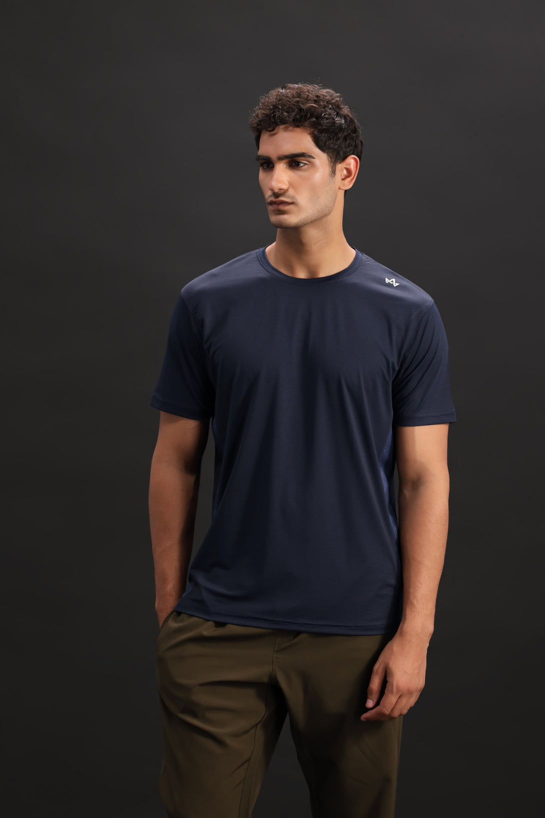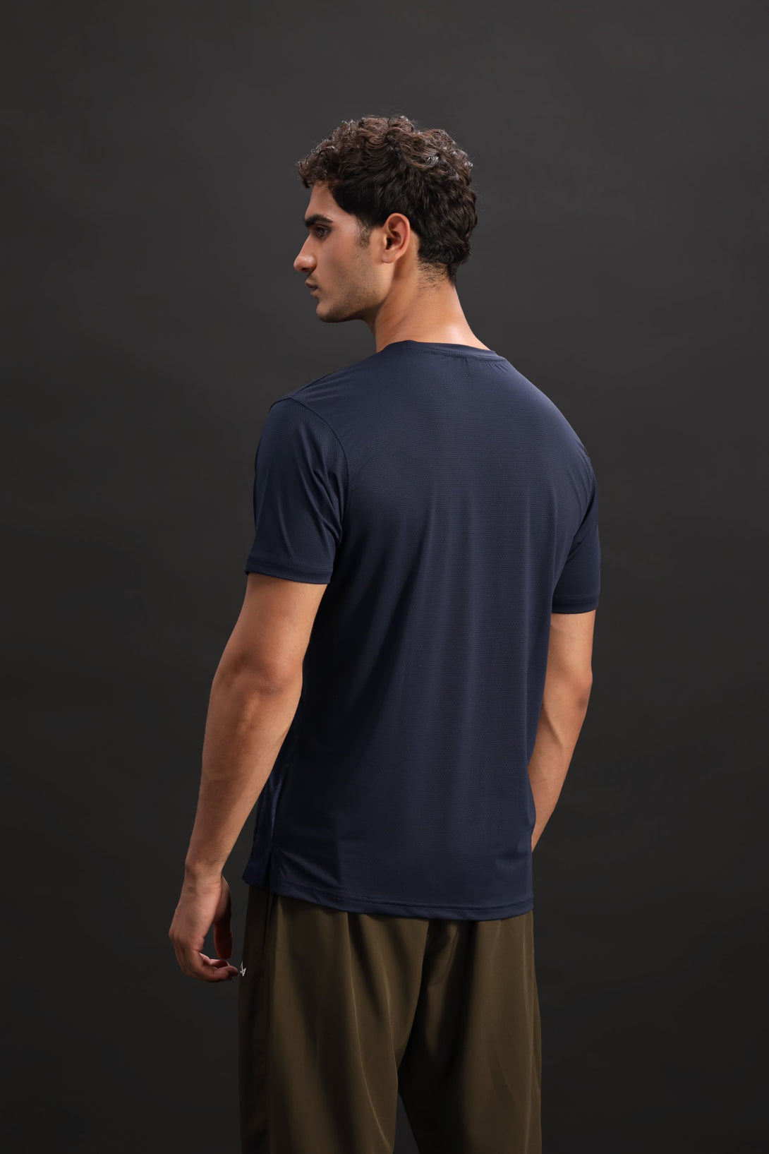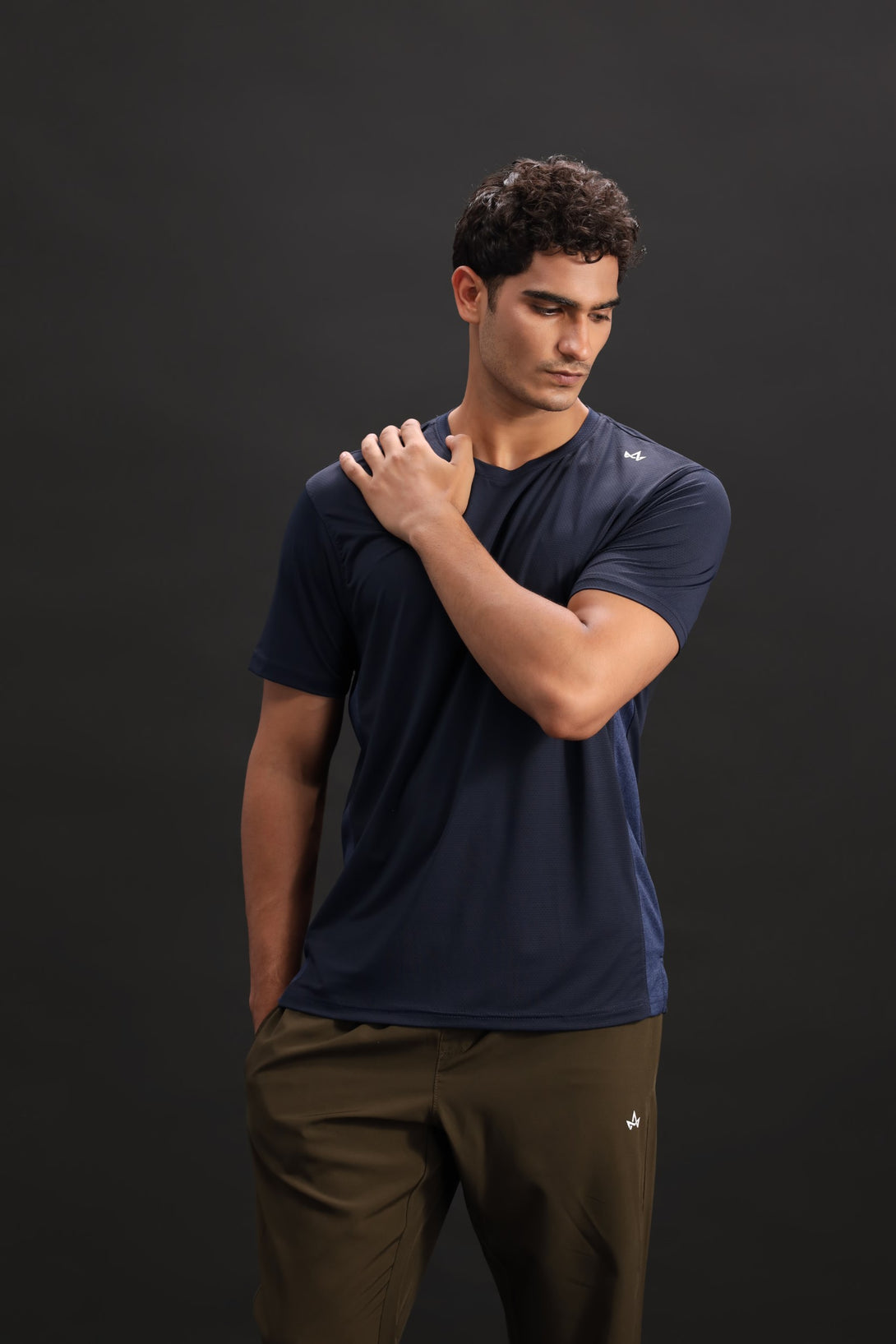 Made for motion, this navy blue stretch-fit tee hugs the form with adaptive fabric. The minimalist design is elevated by a bold Alpha logo placed on the left shoulder—sleek, understated, and focused on performance.