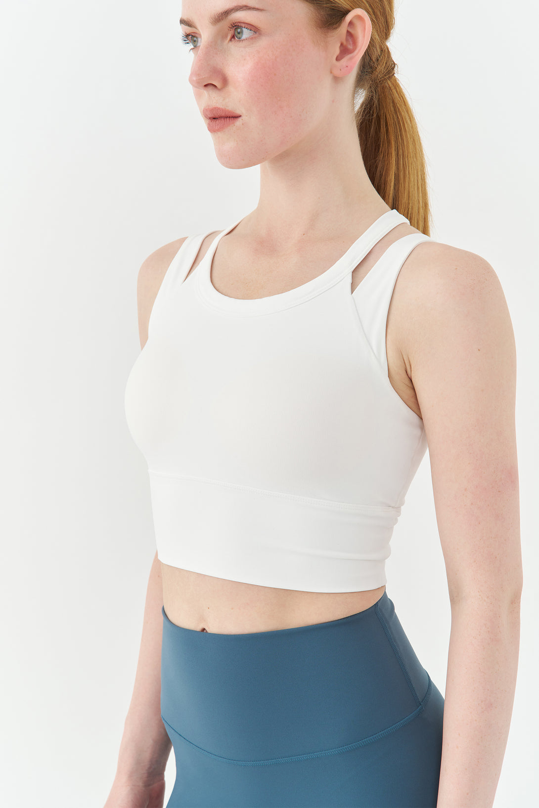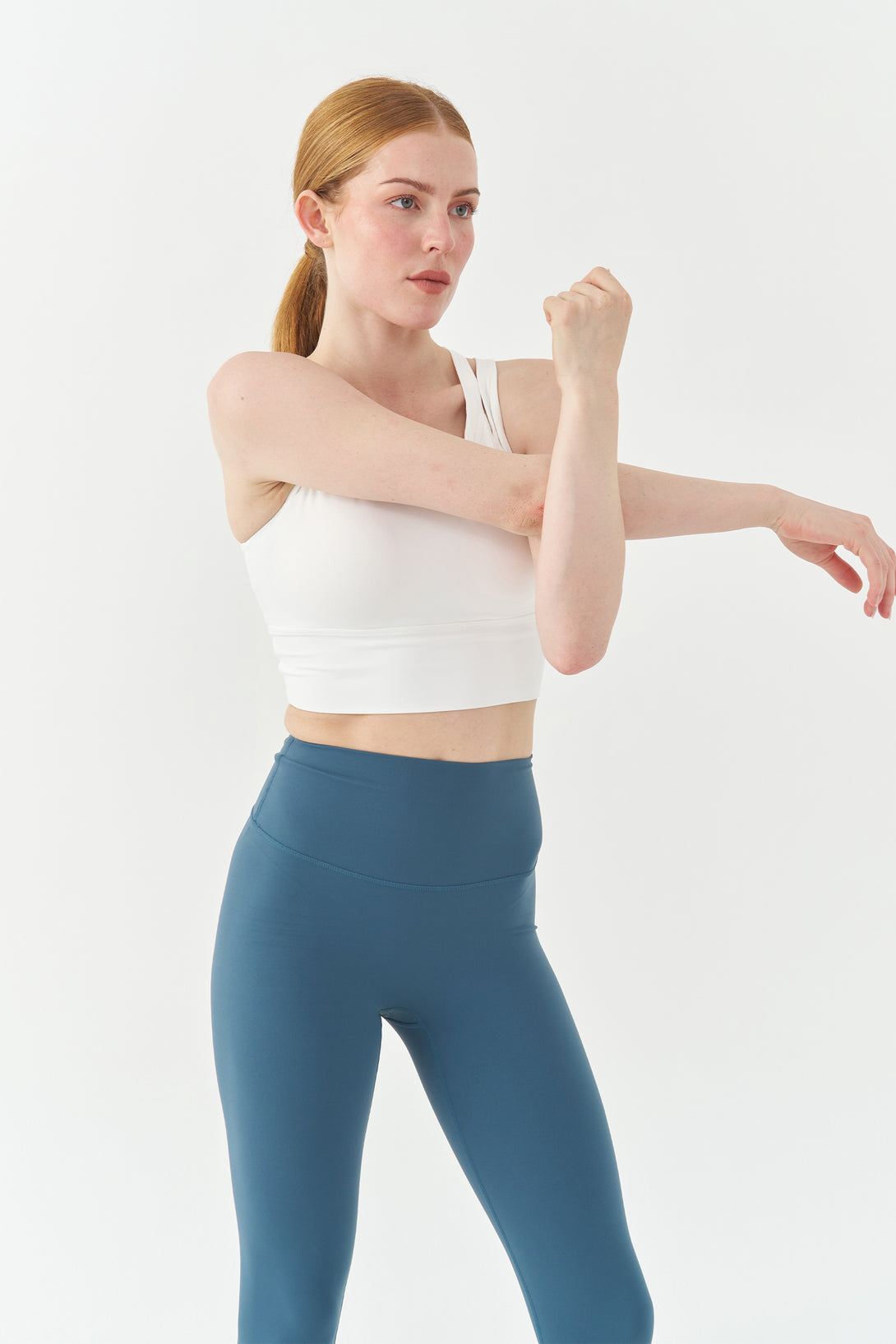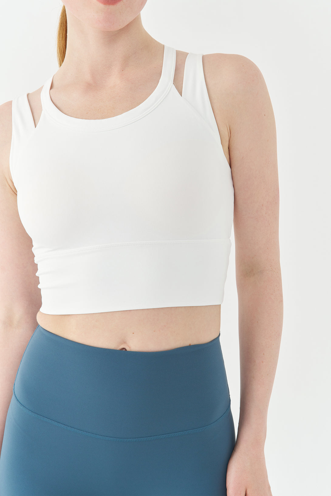 Fresh and performance-ready, the White Glide-Fit Sports Bra delivers padded support with a smooth, contouring fit. Its clean silhouette and comfortable stretch make it a must-have basic for training or daily wear.